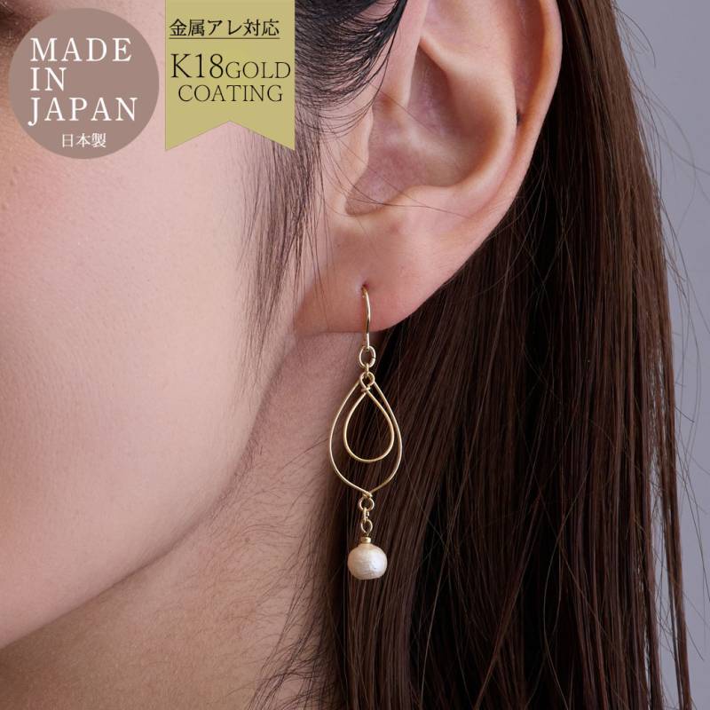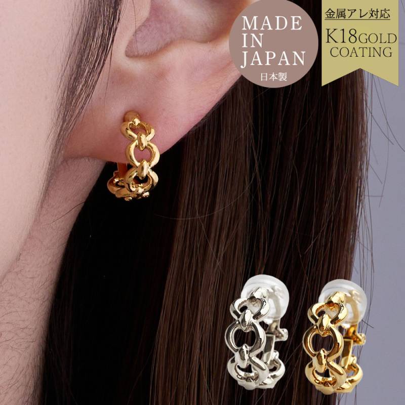 日本製 保護カバー付き 耳元を華やかにする、立体チェーンフープイヤリング 金属アレルギー対応