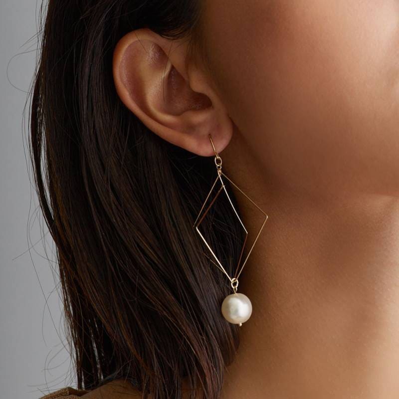 イヤリング ピアス K18 樹脂ノンホール スクエア シェイプ 立体 ワイヤー 華奢 日本製 おしゃれ ブランド 艶パール オフィス 結婚式 ゴールド 18金