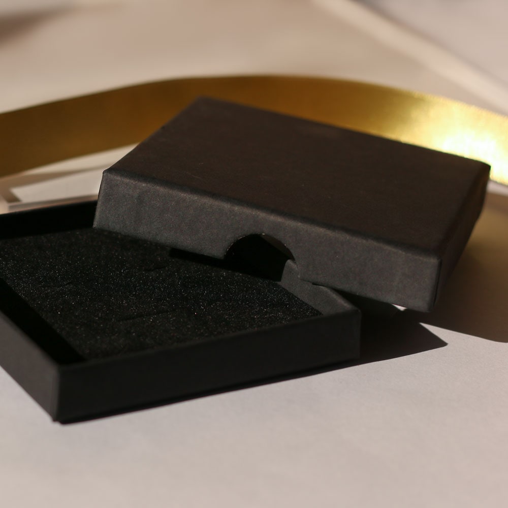 ブラックのかっちりとしたプレゼントボックスにゴールドのリボンをかけ、