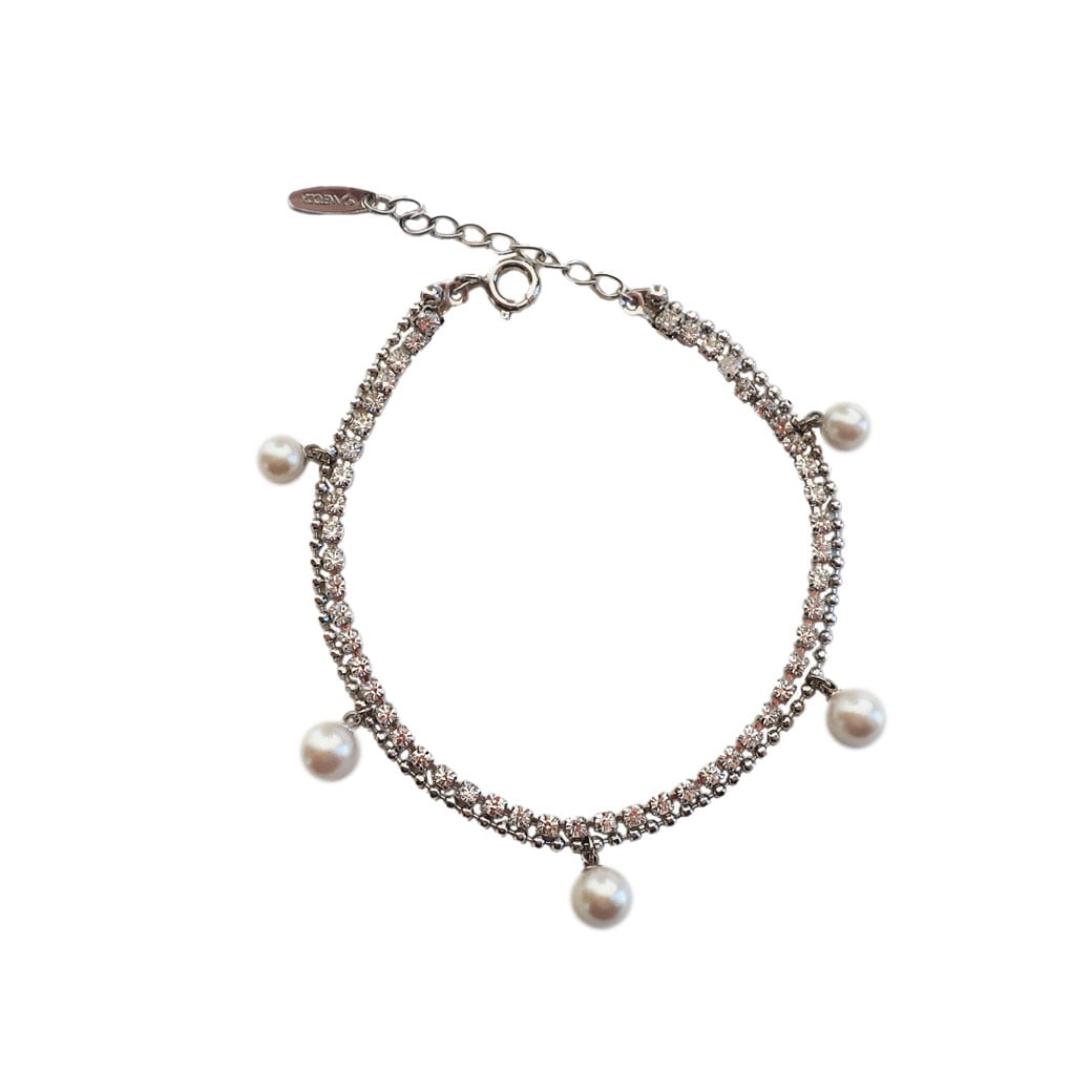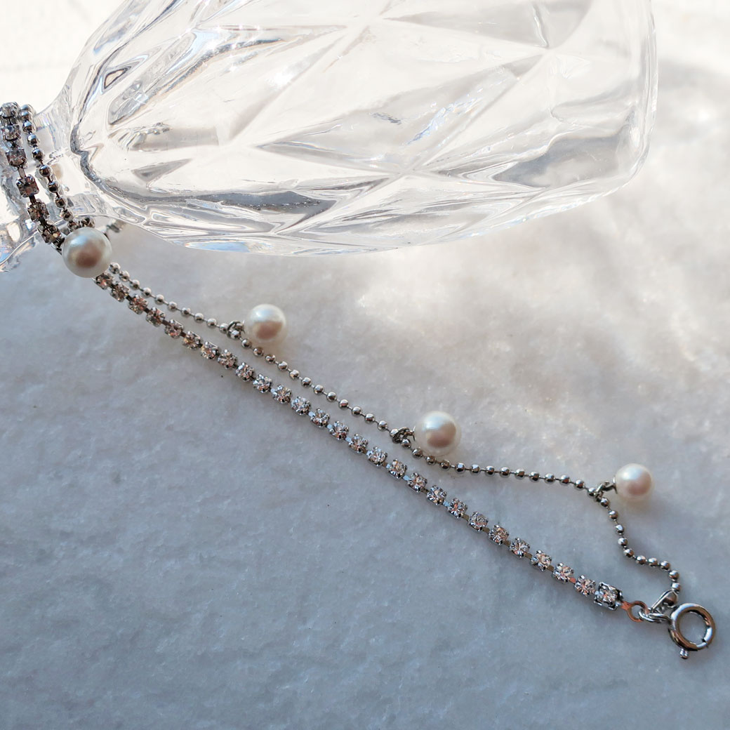 手元を上品に彩る、パール×ラインストーンチェーンの華奢ブレスレット。