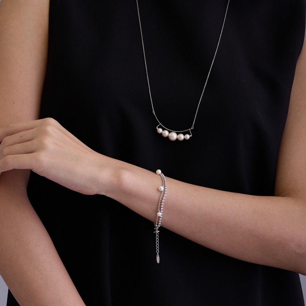煌めくビジューなチェーンに小粒パールをあしらった上品バングル。動くたびに輝き、手元に洗練された印象をプラス。大人の女性に寄り添うエレガントなアクセサリー。