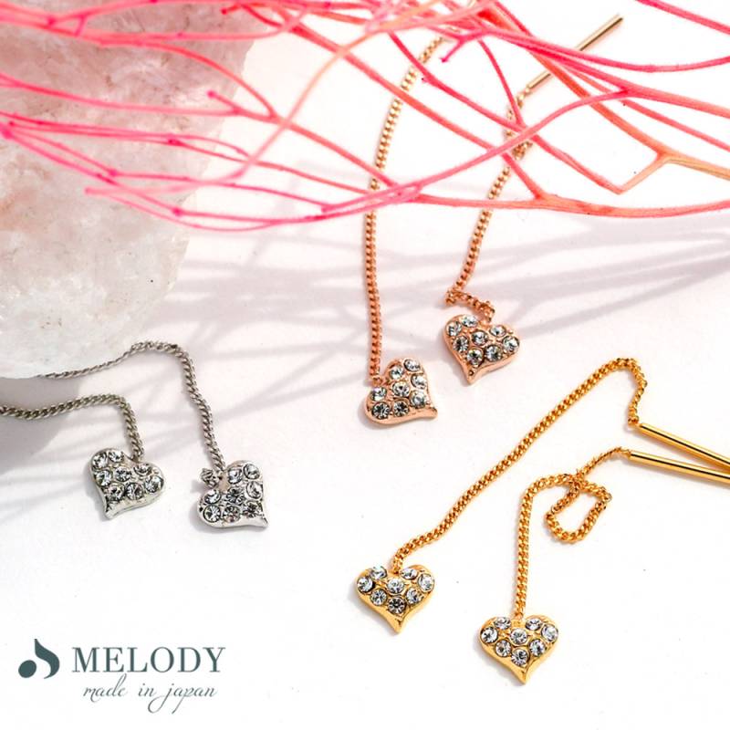 送料無料 ハートパヴェが上品に揺れて輝くアメリカンピアス チェーンピアス