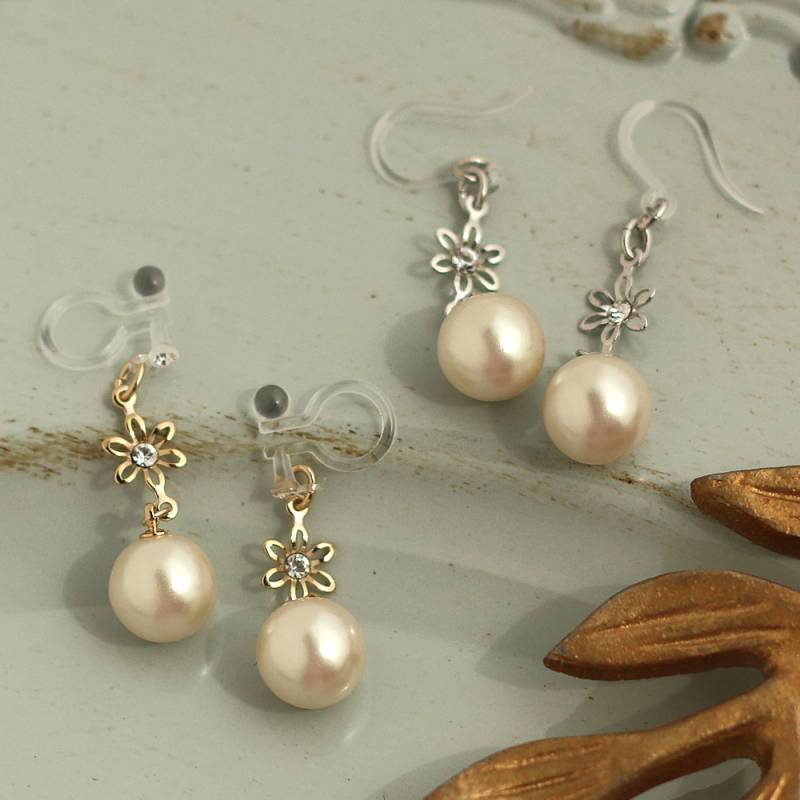 送料無料 日本製 透かしフラワー&パールのスイングピアス&ノンホールピアス