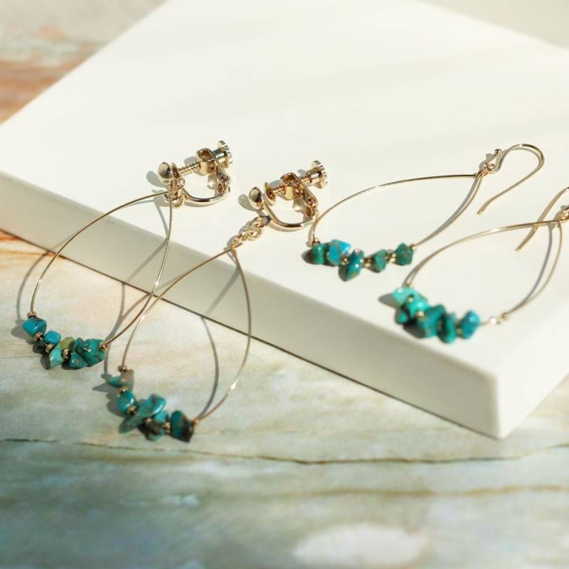 送料無料 日本製 華奢ラインがスイングする、天然ターコイズのピアス/イヤリング