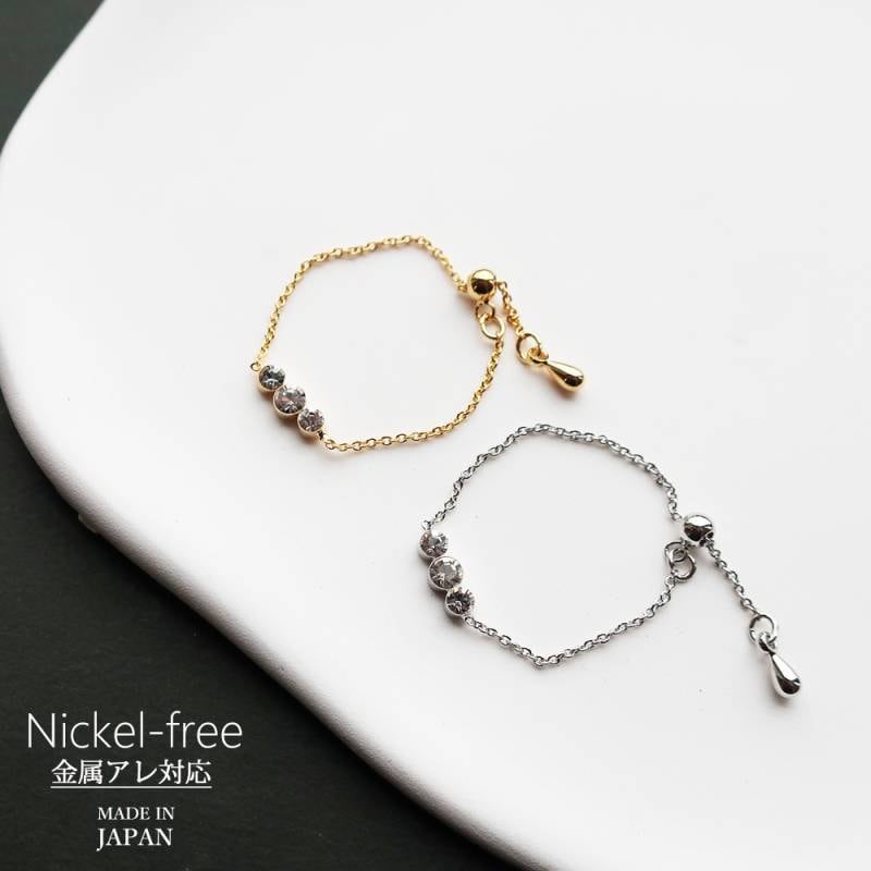 日本製 リング チェーン 3ビジュー 指輪 フリーサイズ レディース