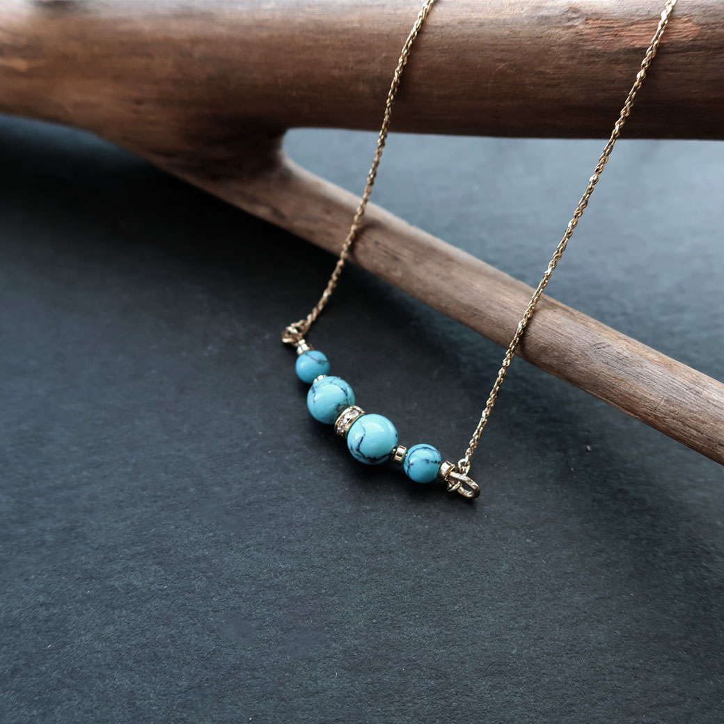 ネックレス中央に向かってグラデーションのように並ぶ5粒のビーズが、歩くたびにきらめきを添えます。