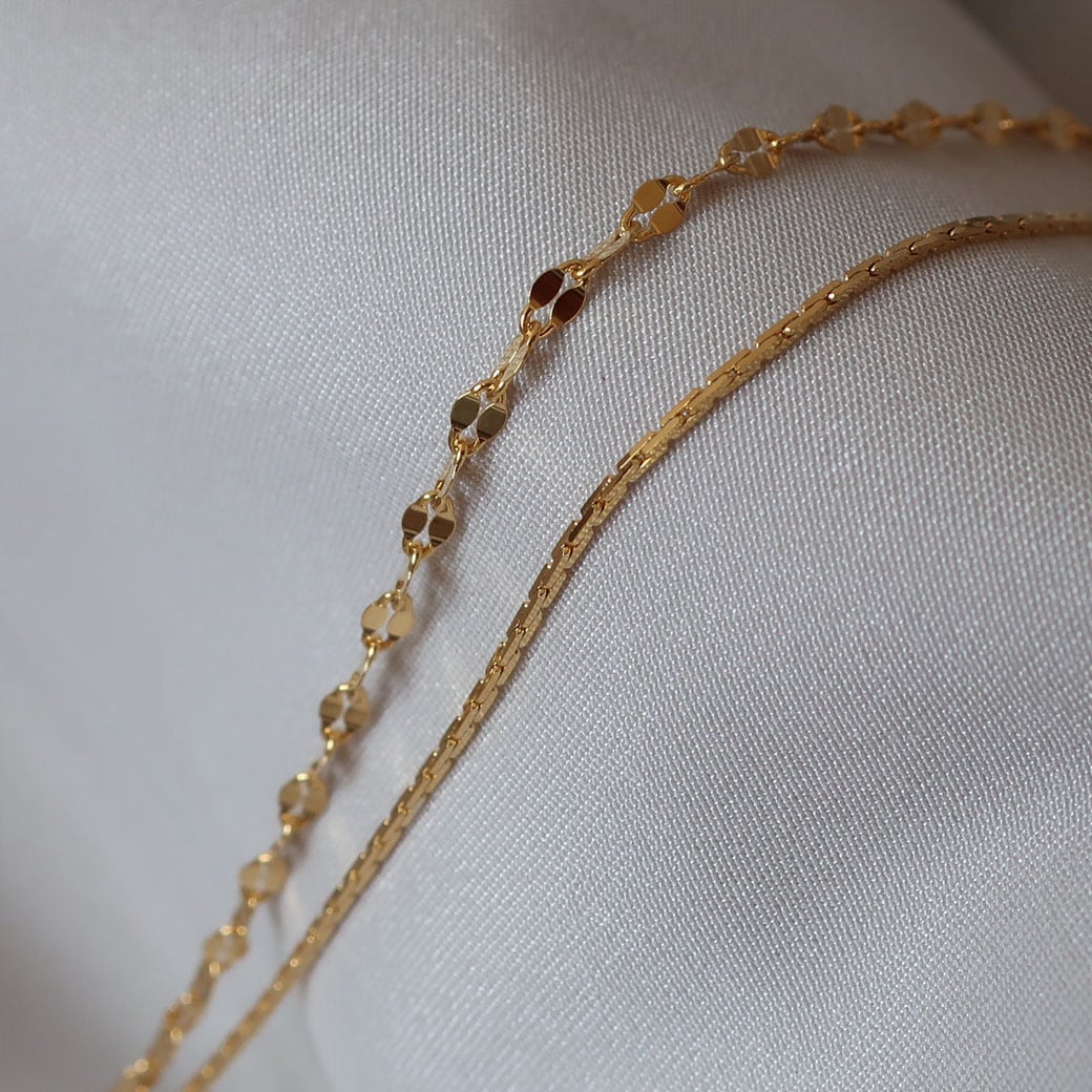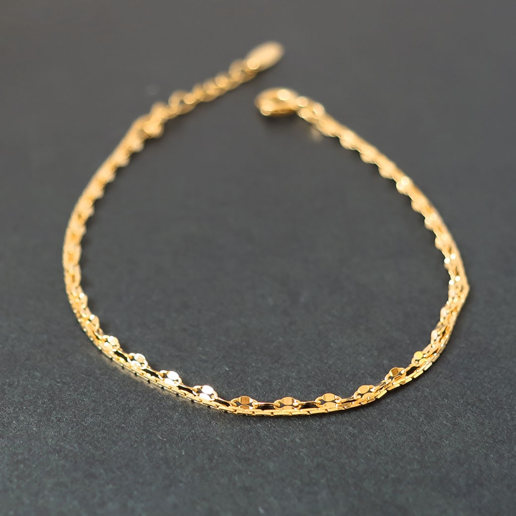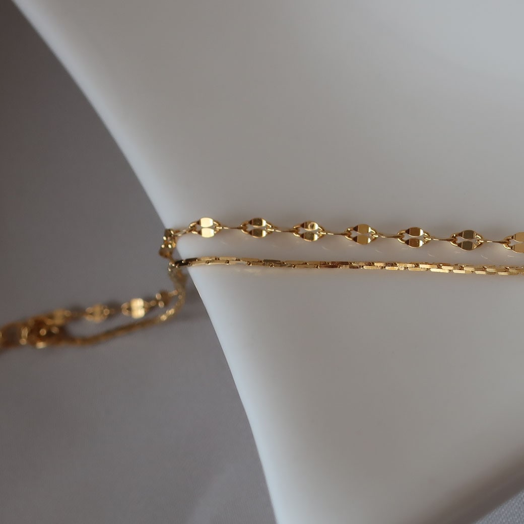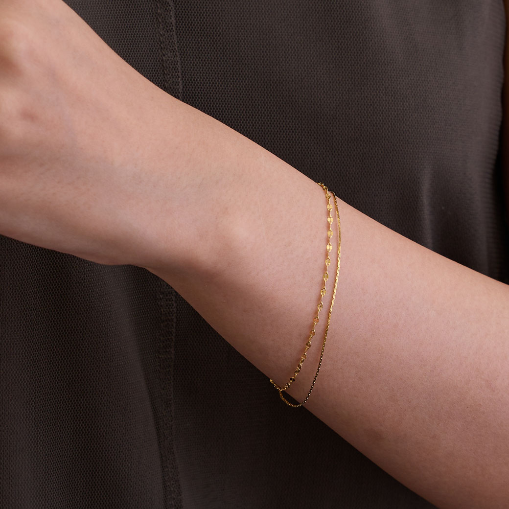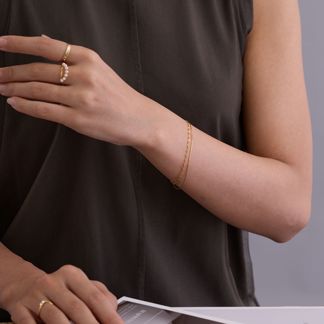 繊細なチェーンが2本重なり、手元にさりげない華やぎを添える2連ブレスレット。