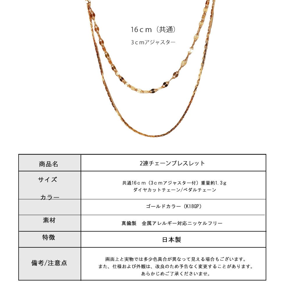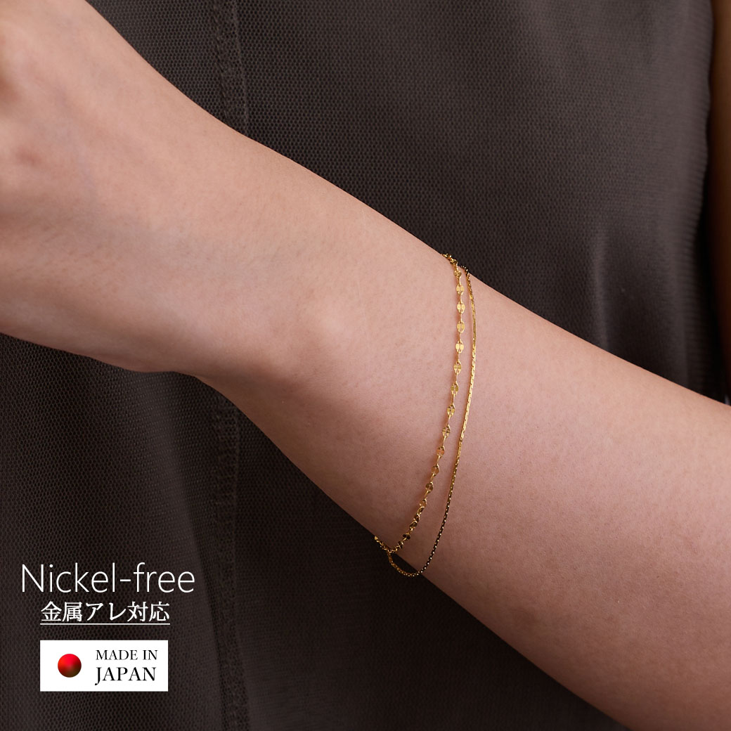 繊細な2連チェーンが手元を美しく彩る日本製ブレスレット。金属アレルギー対応のニッケルフリー素材で、毎日使える安心設計。
