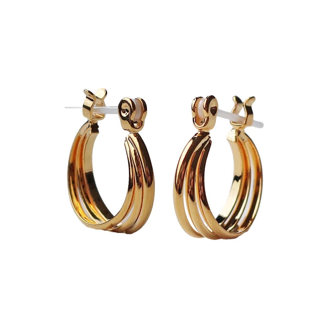 金属アレルギー対応のセラミックポスト付き三連ゴールドフープピアス
