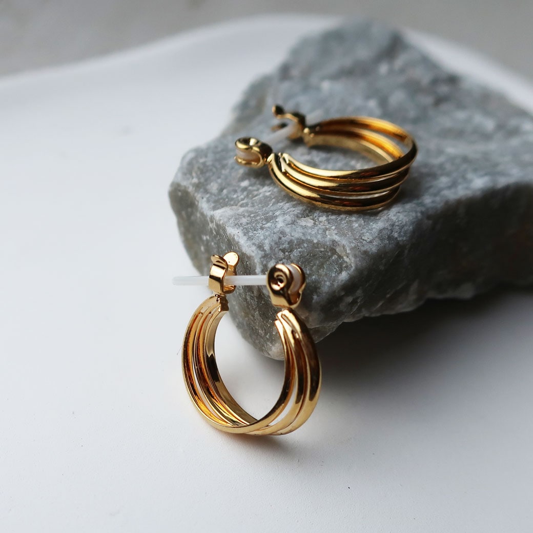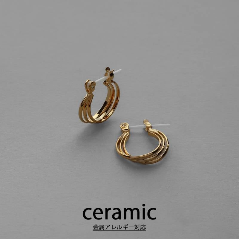 金属アレルギー対応のセラミックポストピアス。三連ゴールドフープが耳元を華やかに演出。肌にやさしい素材で、敏感肌の方にも安心。軽量・高見え・毎日使える万能アクセサリー
