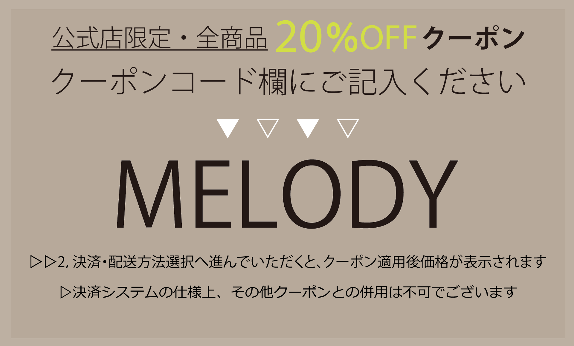 1,ご注文確定前に【クーポンコード記入欄】に【MELODY】とご記入ください。