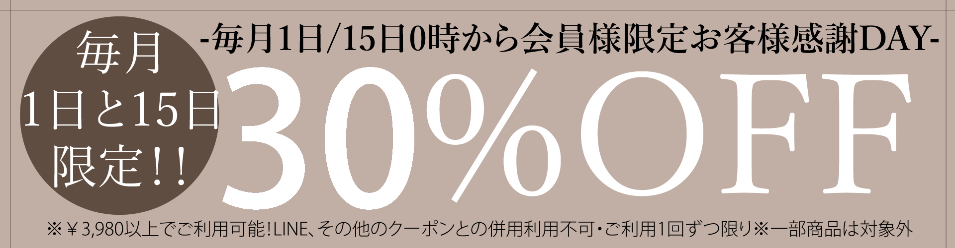 毎月1日と15日の0:00からは会員様限定!\30%OFF感謝デー!/※¥3,980以上ご購入でご利用可能